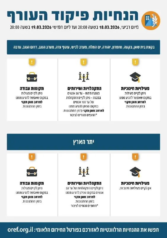 Following a situation assessment, the Home Front Command's defense policy remains unchanged and in effect from Wednesday, March 18, 2026, at 20:00 until Thursday,