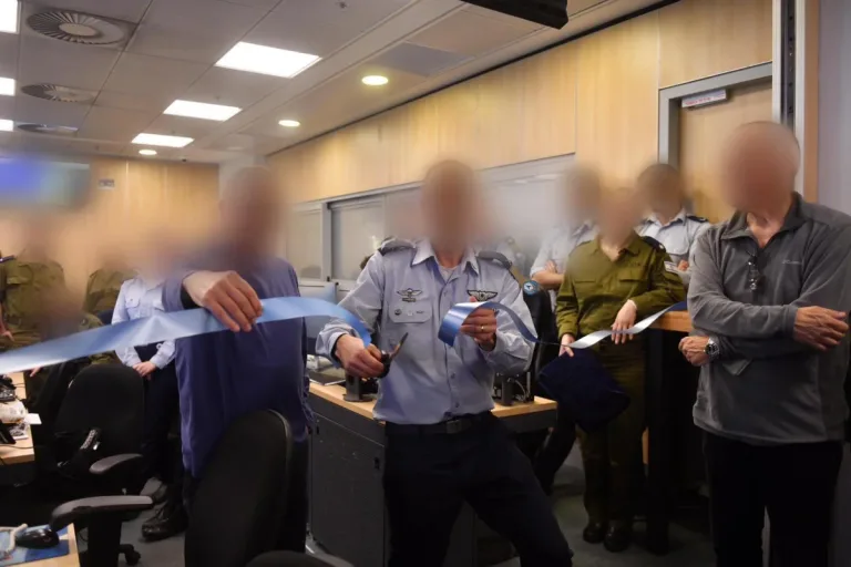 On the way to the ribbon-cutting ceremony for the Hes-She-Rem (HSH) Operations Room, we handed over our phones by the elevator leading to the entrance, and descended further and further (in the Air Force bunker, it’s hard to be sure how many floors). At the ‘ceremony’ itself, surrounded by warning screens and maps, dozens of soldiers and officers were crowded. Nevertheless, the space felt more spacious than usual – after the wall that had divided the room was folded away that day, marking the unification of the two cells – ‘Oz’ and ‘Zion’.