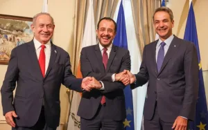 Israeli Prime Minister Benjamin Netanyahu, Greek Prime Minister Kyriakos Mitsotakis, and Cypriot President Nikos Christodoulides are expected to discuss energy cooperation, protecting offshore assets, and deterring Turkey.