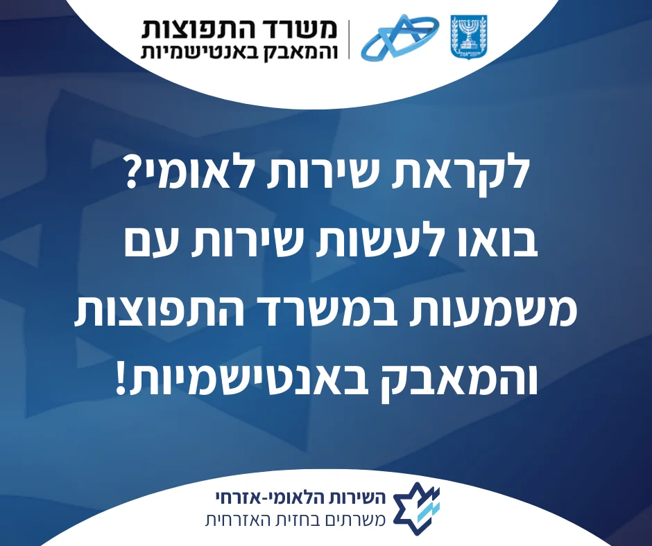 The Ministry of Diaspora Affairs and the Fight Against Antisemitism calls on young men and women from all over the country to join national service of exceptional value – at the heart of the campaign to strengthen the connection between the State of Israel and world Jewry, and in the global fight against antisemitism.