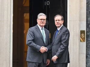 Prime Minister Starmer welcomed President Herzog in front of the historic building before the two leaders held a private meeting followed by a wider bilateral diplomatic discussion.