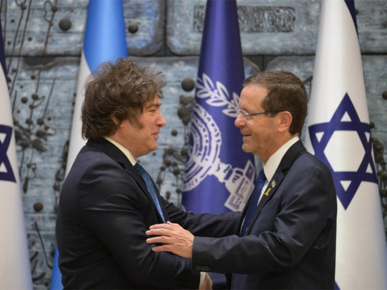 President Herzog: “Welcome, my friend President Javier Milei, to Israel. On behalf of the State of Israel – I am very pleased to host you again. Just a few months ago, we marked 75 years since the establishment of diplomatic relations between Argentina and Israel – in a ceremony I had the honor to participate in, alongside our friend Ambassador Rabbi Shimon Axel Wahnish. I am glad that thanks to your leadership, my friend Mr. President, and your friendship – after all, your name “Javier” resembles the Hebrew word for “friend” – we are able today to mark not only 75 years of bilateral relations, but also a historic peak in the warm relations between our countries.”