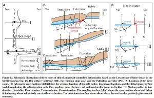 Through detailed seismic mapping and structural restoration of the structures in time and space, the researchers demonstrated that Dor is a rollover anticline in an extensional regime, leaning on a major listric fault, while Palmahim is a rapidly gliding corridor bounded by two strike-slip faults that developed much later due to the underlying pre-salt topography.