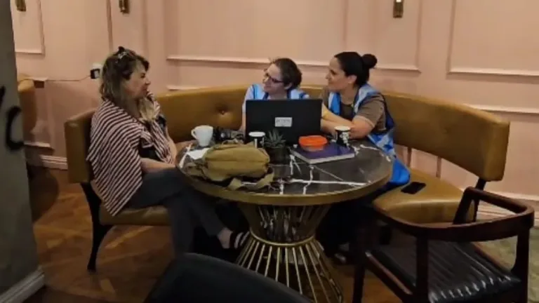 The social workers have arrived at the evacuated hotels and can be identified by a blue or yellow vest.