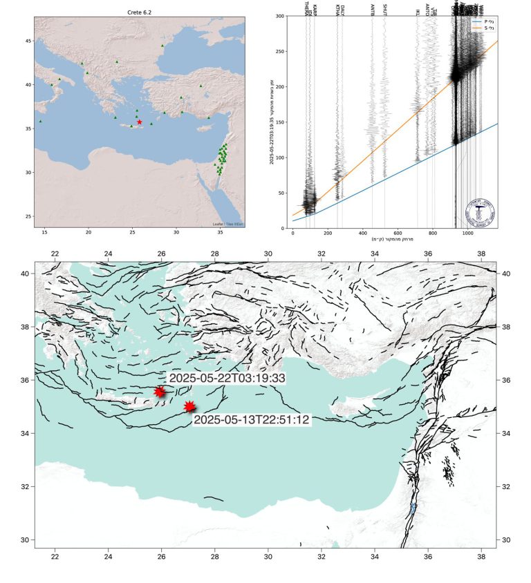 Recording of the 6.3 magnitude earthquake which took place on May 22nd 6:19, Israel time next to Crete (red star on the map).